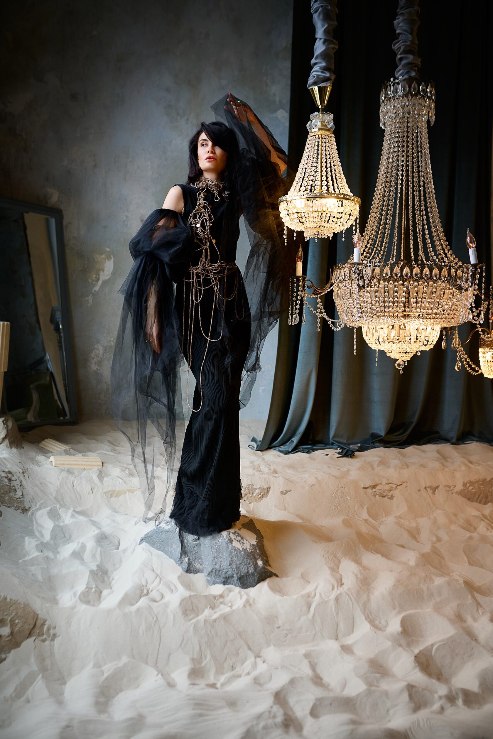 Очень атмосферный look! Корсет МРАМОР В серых тонах. Из шифона. С драпировкой складками и декором из металла и страз сваровски. Сзади застежка на молнию + механизм регулировки размера. Размер 40 - 46. Юбки из фатина могут быть разными. Подбираются под запрос и дрескод.